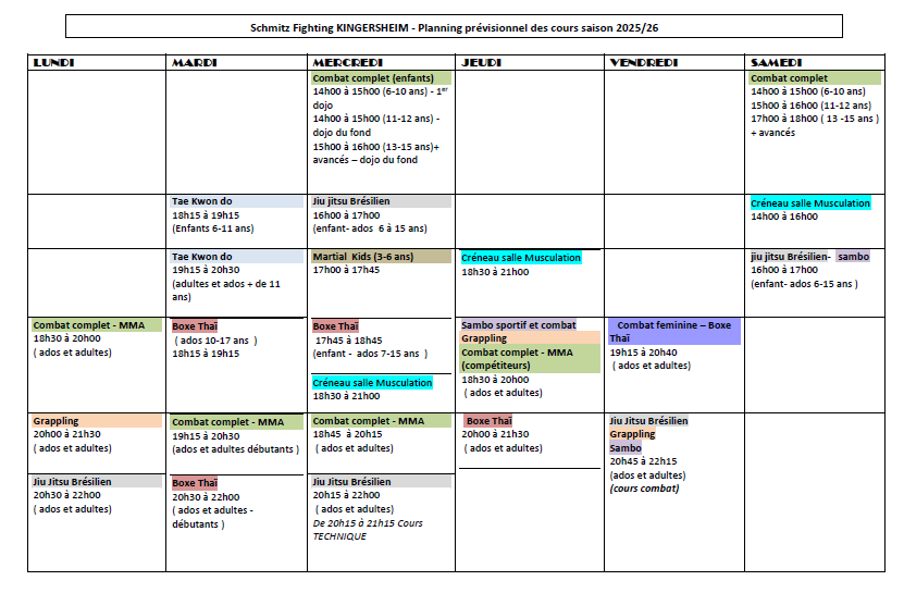 | Samedi : Martial Kids de 13h45 à 14h30 ( initiation 3-6 ans) Tae Kwon Do de 14h30 à 15h30 enfants de 6 à 12 ans de 15h30 à 16h30 + de 12 ans et adultes Combat Complet de 14h30 à 15h30 enfants de 6 à 12 ans de 15h30 à 16h30 + de 12 ans (jusqu’à 17h pour les + de 15 ans) MMA de 15h30 à 17h00 ados + de 14 ans et adultes |