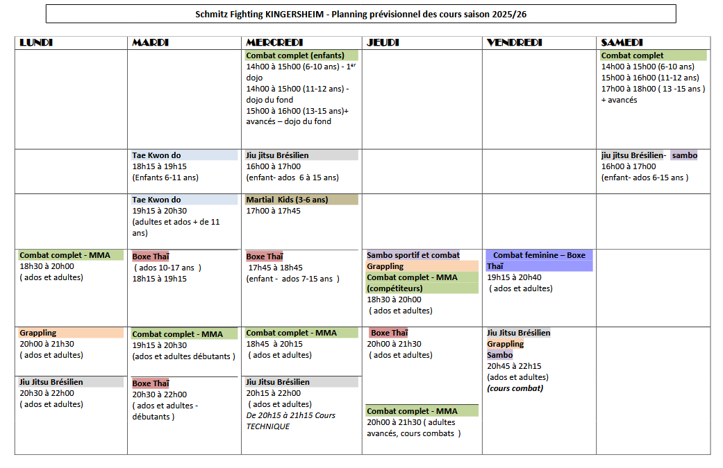 Samedi : Martial Kids de 13h45 à 14h30 ( initiation 3-6 ans) Tae Kwon Do de 14h30 à 15h30 enfants de 6 à 12 ans de 15h30 à 16h30 + de 12 ans et adultes Combat Complet de 14h30 à 15h30 enfants de 6 à 12 ans de 15h30 à 16h30 + de 12 ans (jusqu’à 17h pour les + de 15 ans) MMA de 15h30 à 17h00 ados + de 14 ans et adultes |